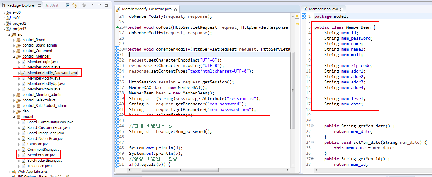 jsp&servlet에서는 하나의 MemberBean으로만 jsp의 로그인, 회원가입, 비밀번호 수정, 회원 수정 post들을 처리했었다. 그러다보니 PasswordModify의 control에서 필요한 것은 3개인데 통합된 MemberBean을 쓰다보니 안쓰는 값들도 메모리에 초기화되어 싣게되면서 비효율이 발생된다는 것을 스프링 DTO 만들면서 알게되었다.