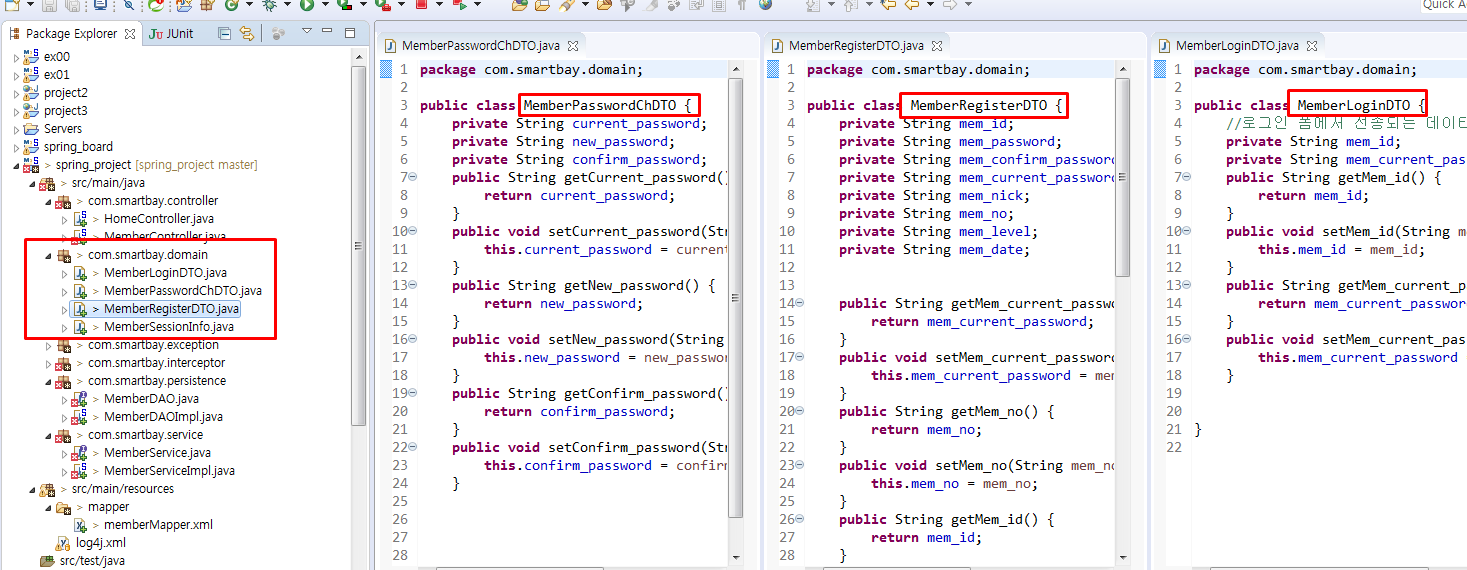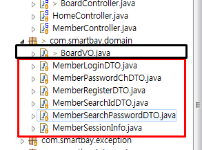 이와 달리 Spring에서는 아래의 그림과 같이 jsp에서 post로 넘겨주는 값 별로 DTO를 만들어 개별적으로 처리해 좀 더 분화가 잘되어 있다. 그리고 아예 이런식으로 1:1 형식으로 만든 DTO덕분에 SQL의 저장값대로 만든 빈을 만들 필요가 없게 되어 관리적인 측면에서는 분화가 잘 되어 있어서 좋았다.