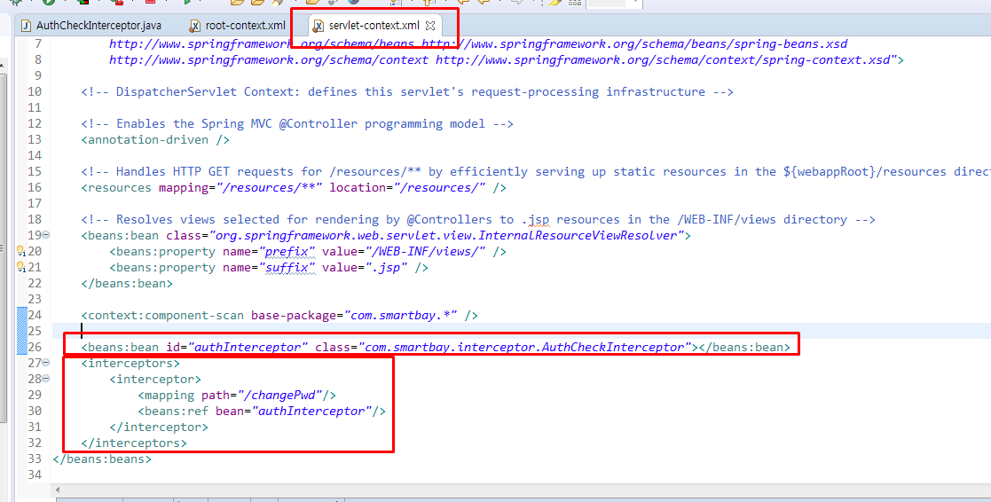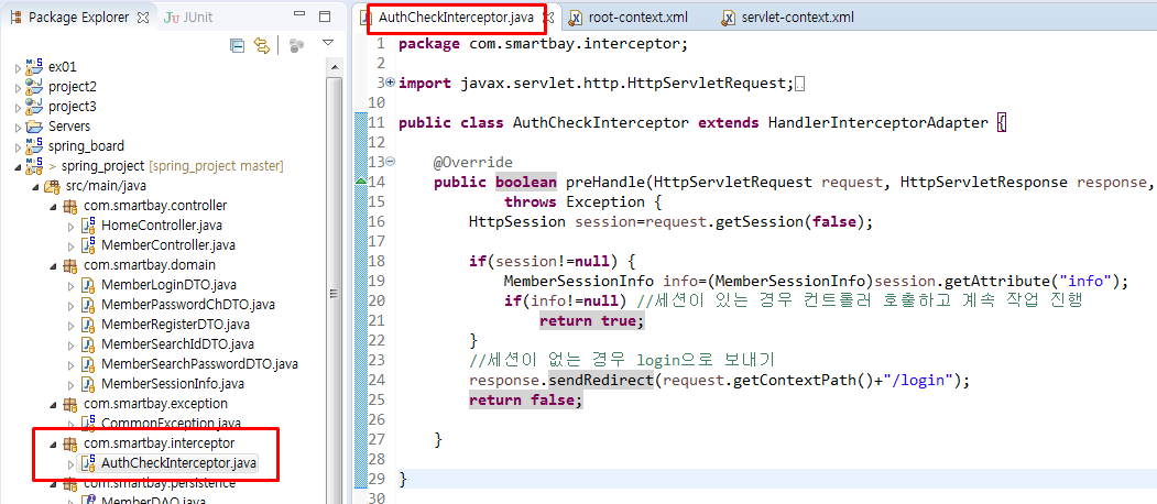 하지만, 인터셉터를 이용하면, A, B, C 작업(A,B,C 경로로 요청)을 할 경우에는 ~~Interceptor를 먼저 수행해 session에서 로그인 정보가 있는지 확인해 주는 역할을 한다면, 중복 코드가 확 줄어들 수 있을 것이다. 이러한 장점 때문에 주로 사용이 된다.