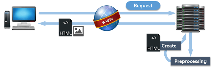 - 서버(웹 서버, Web Server)에 미리 저장된 파일(HTML 파일, 이미지, JavaScript 파일 등)이 그대로 전달되는 웹 페이지