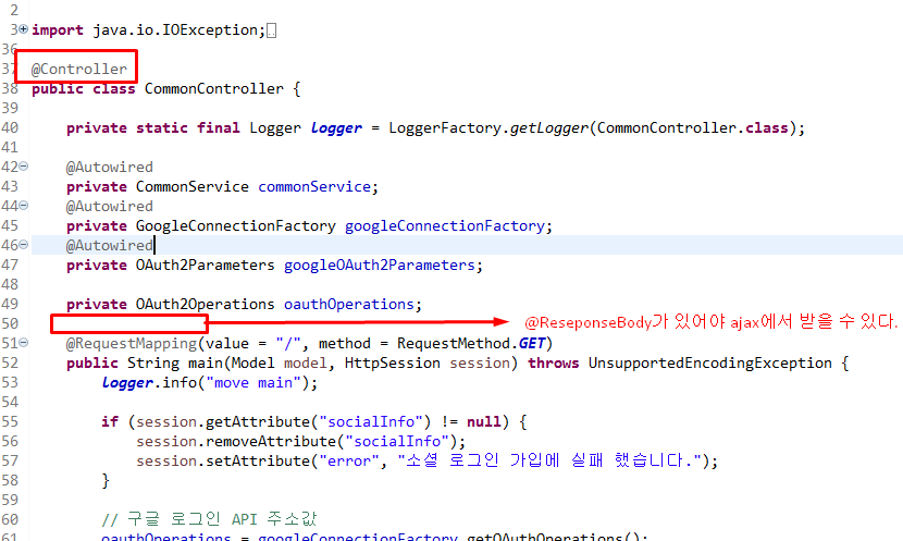이 코드에서는 컨트롤러로 선언했기 때문에 매핑 부분에 @ReseponseBody를 선언해줘야 정상 작동한다.