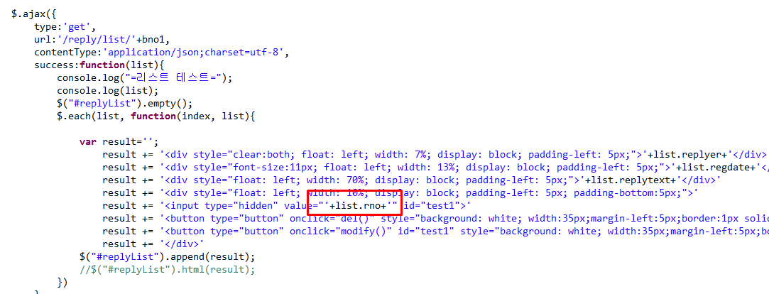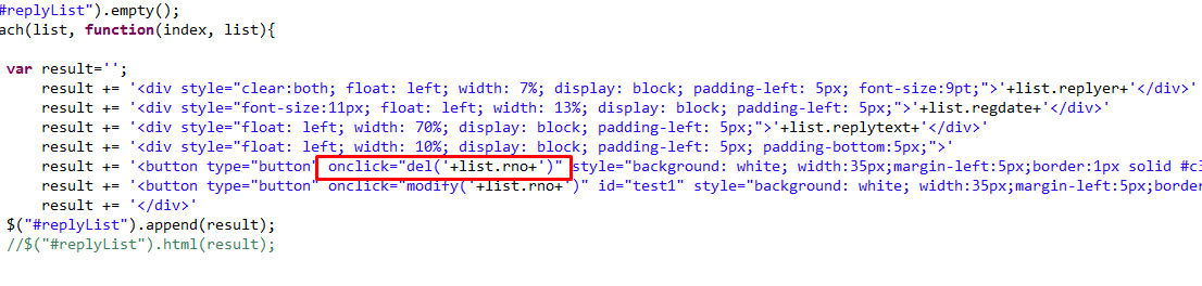 $.each로 result라는 것을 반복을 하게 되는데, 예를 들어 두번째 result를 삭제하려고 하면 첫번째 result가 삭제되는 결과가 나타난다. JSTL로 반복문 작업을하면 이런 문제는 없지만, jQuery 반복문을 쓰게되면 비동기 처리라서 그런지 크롬에서 소스보기에서도 html형식의 형태가 나타나지 않는다.