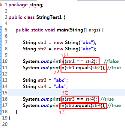 3번 : 문자열 abc 상수 풀에 저장되어 있으므로 str3과 str4가 가리키는 주소 값이 같음