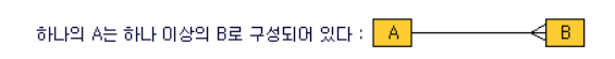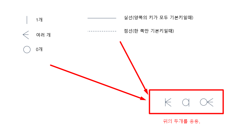 B테이블에 삼지창과 같은 모형이 있는데. A는 B에 여러개가 관련이 있다는 말이다. 위와 동일하게 각 테이블의 기본키 기준이다.