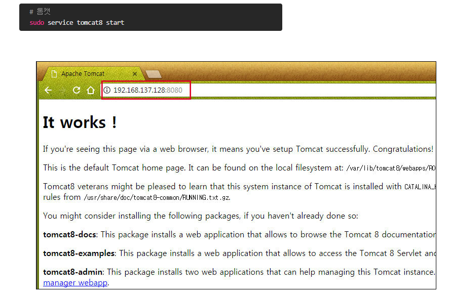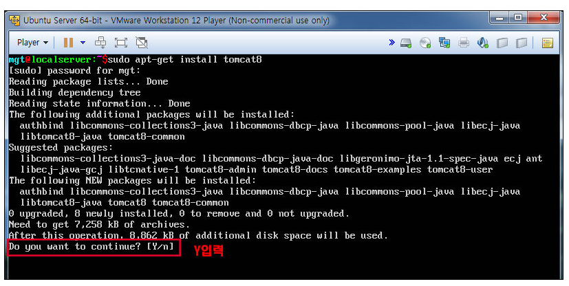 다음의 명령어를 입력하여 우분투에 tomcat8을 설치한다.