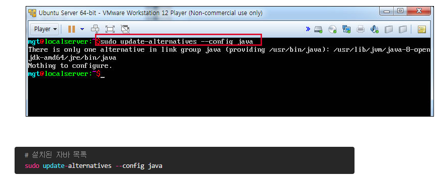만약 여러 종류의 자바가 설치되어 있다면 위 명령어를 통해 Default Java를 선택할 수 있다. 현재는 1개의 자바만 설치되어 명령어를 실행하면 위처럼 나온다.