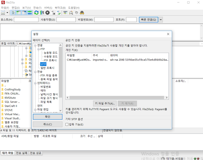 편집 -> 설정 -> SFTP를 클릭한뒤 아까 생성했던 private키를 삽입합니다.