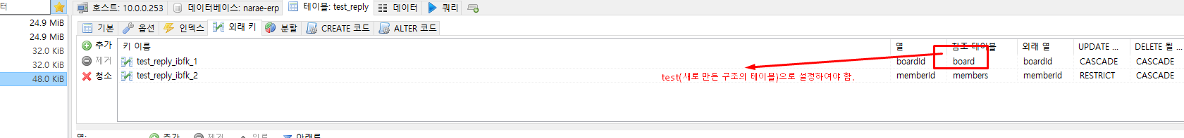 DB의 외래키 설정이 기존의 DB에 연결이 되어 있었다. 그래서 새로 만든 DB에 외래키 잡아주니 깔끔하게 해결되었다.