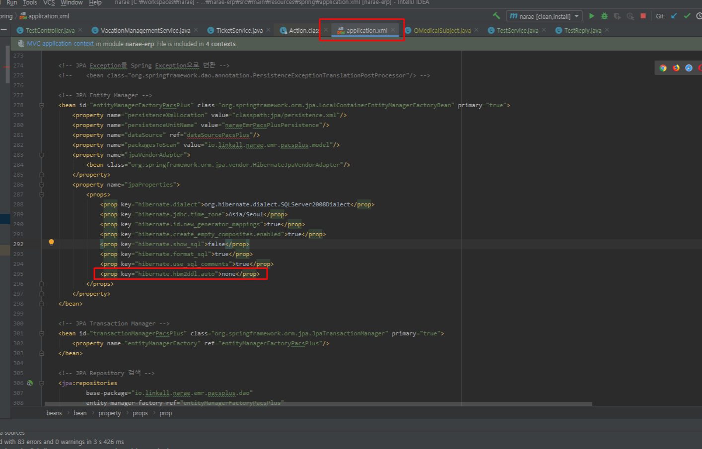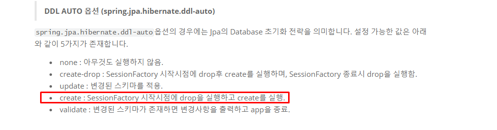 저기의 설정이 "none"으로 되어있는데 원래 개발을 시작 할 때에는 아래의 그림에서 update를 사용하여 자동으로 DDL을 생성하여 필요한 Databvase의 테이블 설정들을 자동으로 수행하게끔되어 있지만,
