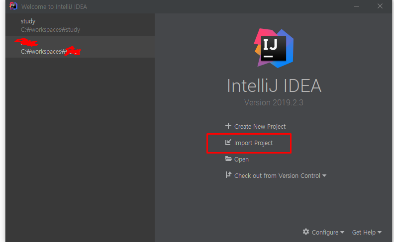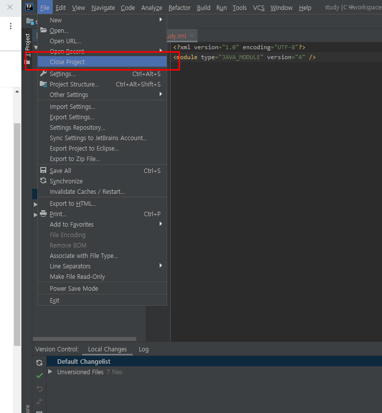 이클립스의 경우 여러 프로젝트들이 Project항목에 나열되는 반면에 IntelliJ에서는 1개의 윈도우에 1개의 프로젝트 정책을 하고 있어 "close poject"를 선택 해 주어야 한다.