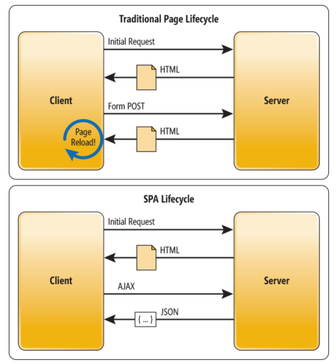 기존 웹 서비스는 요청시마다 서버로부터 리소스들과 데이터를 해석하고 화면에 렌더링하는 방식이다. SPA형태는 브라우저에 최초에 한번 페이지 전체를 로드하고, 이후부터는 특정 부분만 Ajax를 통해 데이터를 바인딩하는 방식이다.