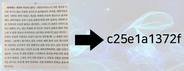 문장 길이에 관계없이 일정한 길이의 값으로 변경할 수 있어 용량 절약이 되고, 또한 원문이 같으면 해시값도 완벽히 일치합니다. (그림의 오른쪽으로 변환해주는 것을 '해시함수'가 해줍니다.)