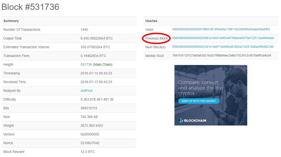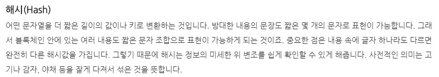 블록에 직전 블록의 해시값이 있기 때문에 이전 블록과 연결되어 있다는 것이고, 모든 블록이 순차적으로 해시를 통해 연결되어 있기 때문에 ‘블록체인’ 이 되는 것이고, 체인 역할을 하는게 해시.