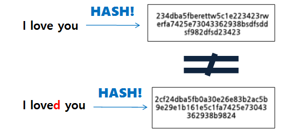 이렇게 하나가 틀리게되면 해쉬값이 완전히 달라진다.