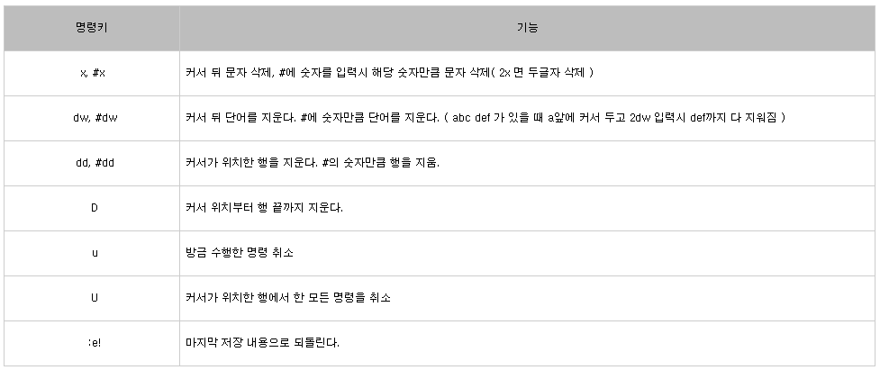 | :q | 작업한 내용이 없을 때 vi 편집기 종료( 작업한 내용이 있다면 나가지지 않는다. ) |