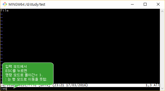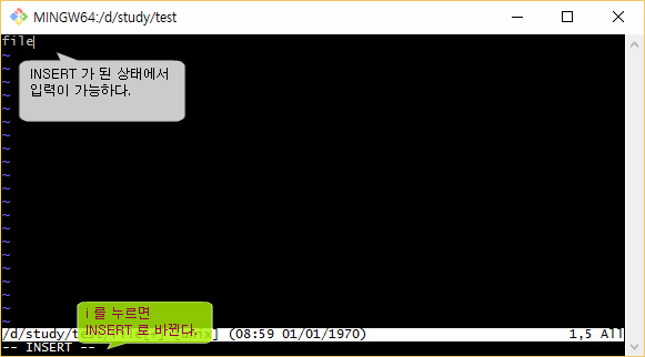 ii) 입력 모드(insert mode) - 명령모드에서 "i" 명령을 통해서 입력 모드로 넘어 갈 수 있는데, 입력모드로 가게되면 자유롭게 코드나 글을 작성을 할 수 있다. 명령 모드로 다시 돌아오려면 "ESC"를 누르면 된다.