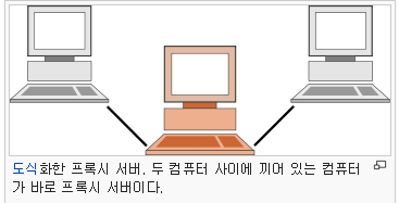 - PC와 외부 인터넷 사이의 징검다리 역할, 이 때 중계하는 프로그램을 Proxy 프로그램이라고 말한다. 이러한 Proxy 프로그램은 서버로서 작동하기 때문에 일반적으로 Proxy Server라고 한다.
