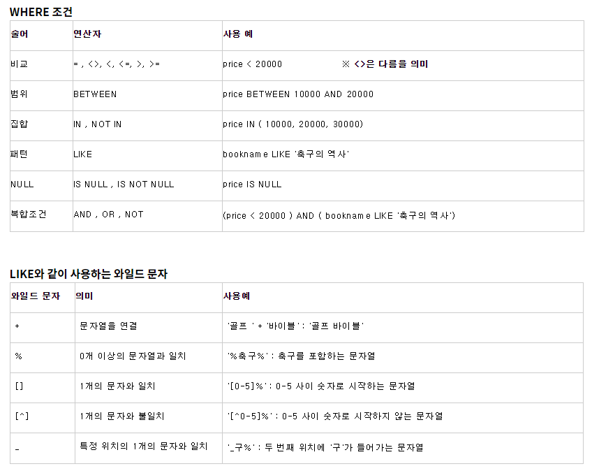 WHERE 조건 (여기서는 여러 조건을 하려면 ","가 아닌 and로 하거나 or을 써야 한다. )