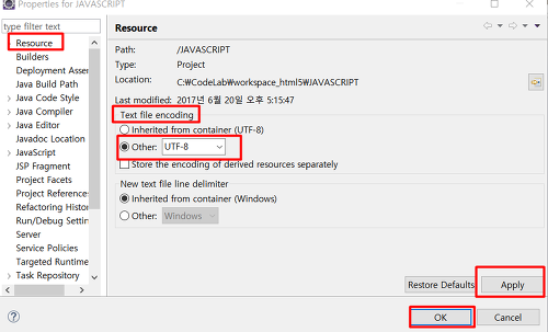 Resource > Text file encoding > Other: UTF-8'을 체크한 뒤 Apply를 클릭하고 OK