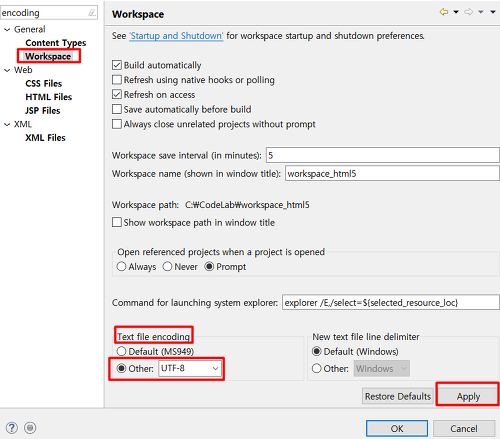 'Workspace > Text file encoding > Other: UTF-8'로 체크한 뒤 Apply를 클릭.