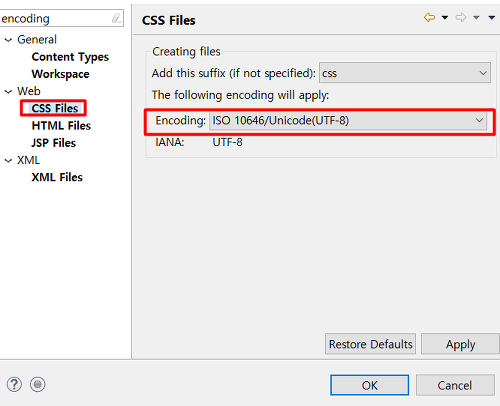 'CSS Files'를 클릭하고 Encoding을 'ISO 10646/Unicode(UTF-8)'로 선택한 뒤, Apply를 클릭.