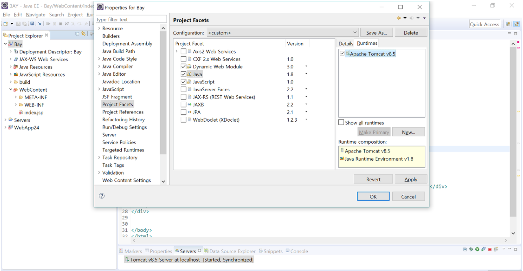 해결단계 ③ Project Facets → Java → Apache Tomcat v8.5 체크 → 확인