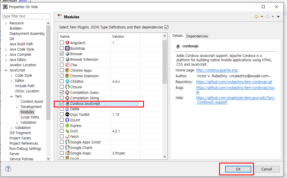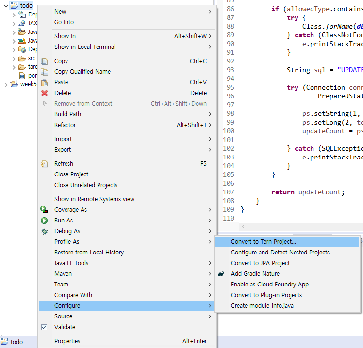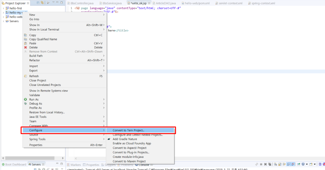 프로젝트 우클릭후 [Configure] - [Convert to Tern Project...] 를 누릅니다.