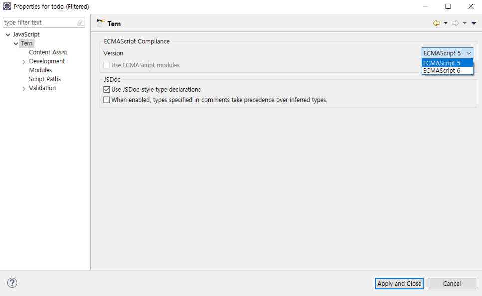 Tern은 기본적으로는 ECMAScript 5를 사용합니다.