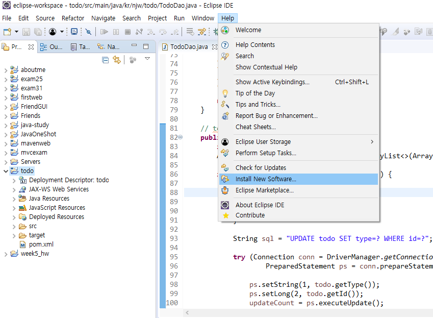 먼저 이클립스에서 [Help] - [Install New Software..] 로 들어갑니다.
