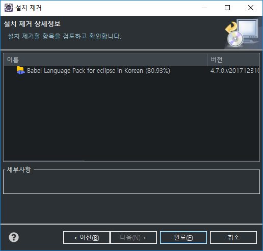 아래쪽에 있는 설치 제거를 클릭하시면 이 창이 뜨는데요. 여기서 완료를 클릭해주세요.