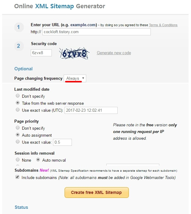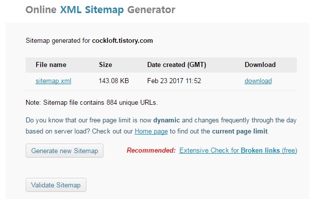 밑에 있는 Create free XMl Sitemap 을 클릭하고 기다리면 됩니다.