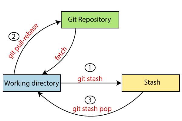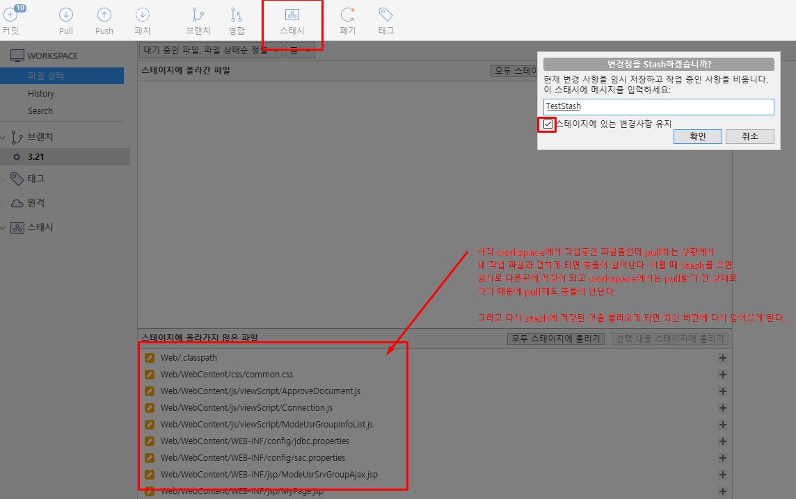 아직 workspace에서 작업중인 파일들인데 pull하는 상황에서 내 작업 파일과 겹치게 되면 충돌이 일어난다. 이럴 때 stash를 쓰면 임시로 다른 곳에 저장이 되고 workspace에서는 pull받기 전 상태로 가기 때문에 pull해도 충돌이 안난다.