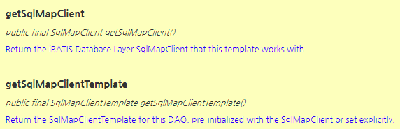 그리고 SqlMapClientDaoSupport 클래스는 실질적인 데이터 조작 및 접근을 위해 다음의 2가지 형태의 메서드를 제공합니다.