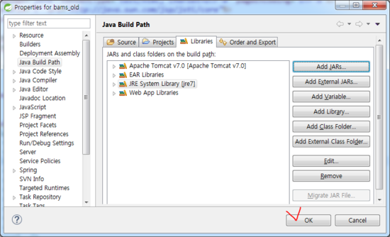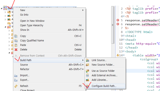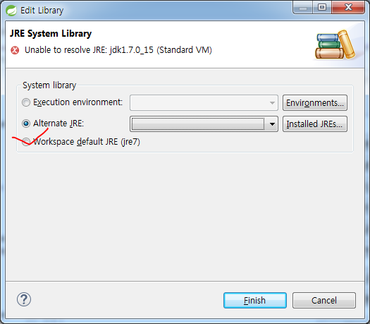 아래 그림들은 순서대로 위에서 말한 build path에 있는 JRE path 를 현재 Spring에 설정된(자신의 컴퓨터에 설치된 JRE)로 변경해주면 된다.