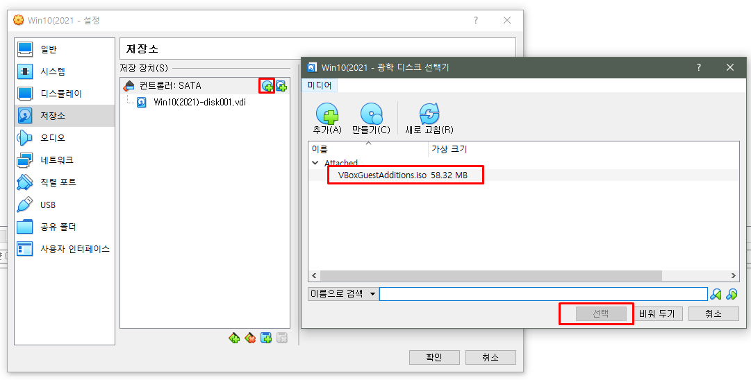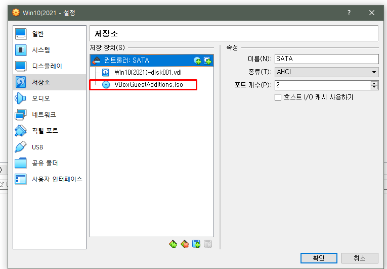 그림1 : VM 설정 페이지를 열어서 광학 디스크(CD)를 넣어주는 작업을 진행한다.