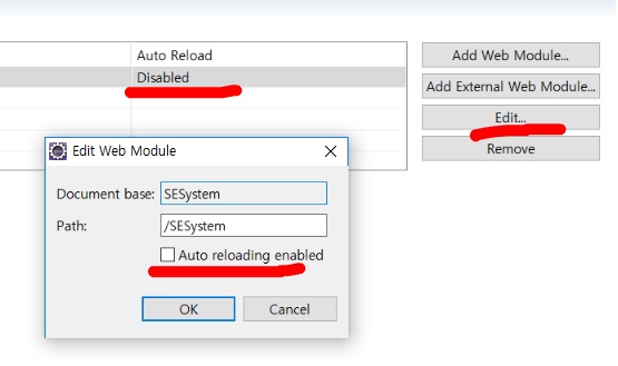 7. Tomcat Modules 탭 > Auto reloading enabled 체크박스 해제