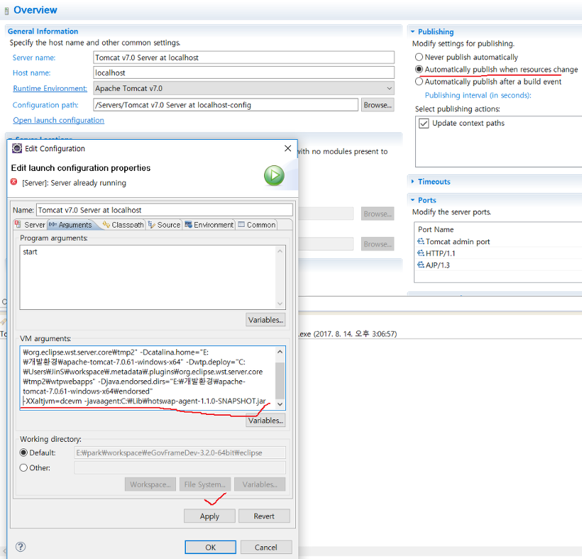 6. Tomcat launch configuration > Arguments > VM arguments 에 추가