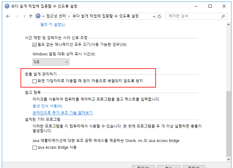체크가 되어 있는 것이 보통 디폴트 값인데, 풀어줘야 창이동 단축키가 작동을하는 이상한 현상.