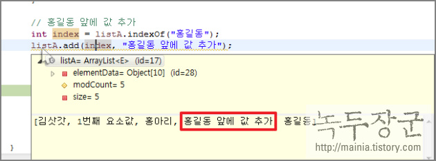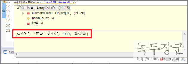 List listA = new ArrayList(); listA.add("김삿갓"); listA.add("홍아리"); listA.add(new String("홍길동")); listA.add(1, "1번째 요소값");
