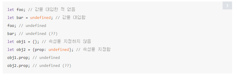 그렇다면 개발자의 입장에서 '없음'을 저장하기 위해 둘 중 어떤 것을 써야 할까요? undefined를 쓴다고 가정해보면, 아래와 같은 코드는 그 의미가 불분명해집니다.