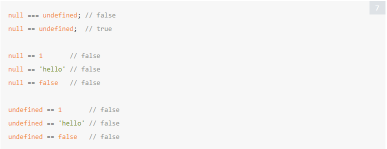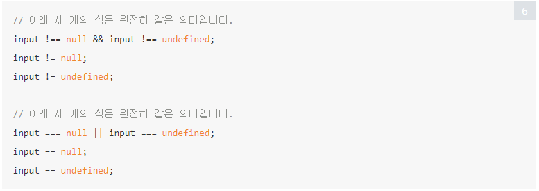 즉, == 연산자는 한 쪽 피연산자에 null 혹은 undefined가 오면, 다른 쪽 피연산자에 null 혹은 undefined가 왔을 때만 true를 반환하고, 다른 모든 경우에 false를 반환합니다.