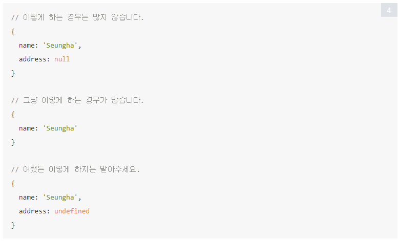 다만, 객체를 사용할 때 어떤 속성의 부재를 null을 통해서 나타내는 쪽보다는, 그냥 그 속성을 정의하지 않는 방식이 간편하므로 더 널리 사용됩니다.