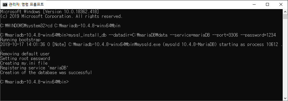 명령 프롬프트에 명령어를 입력 후 엔터를 누르면 위처럼 서비스명인 mariaDB로 설치가 진행됩니다.