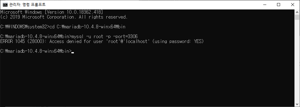 명령프롬프트에서 먼저 cd 명령어로 C드라이브의 마리아DB 파일의 경로 밑에 bin 폴더로 이동합니다.