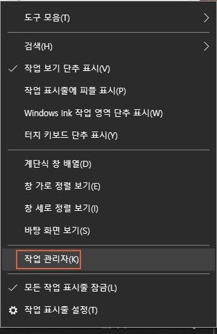 작업표시줄에 마우스 오른쪽 버튼을 눌러 작업관리자로 이동합니다.