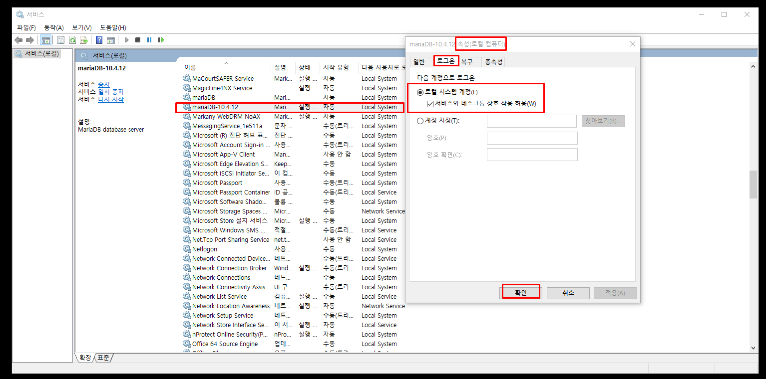 마리아DB의 서비스 등록이 정상적으로 진행되었다면, 윈도우 화면 하단의