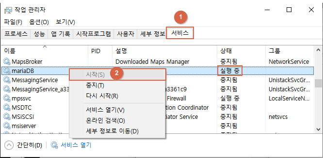 작업관리자의 서비스 항목으로 이동하면 mariaDB 서비스명으로 윈도우 서비스가 생성되어있을겁니다.