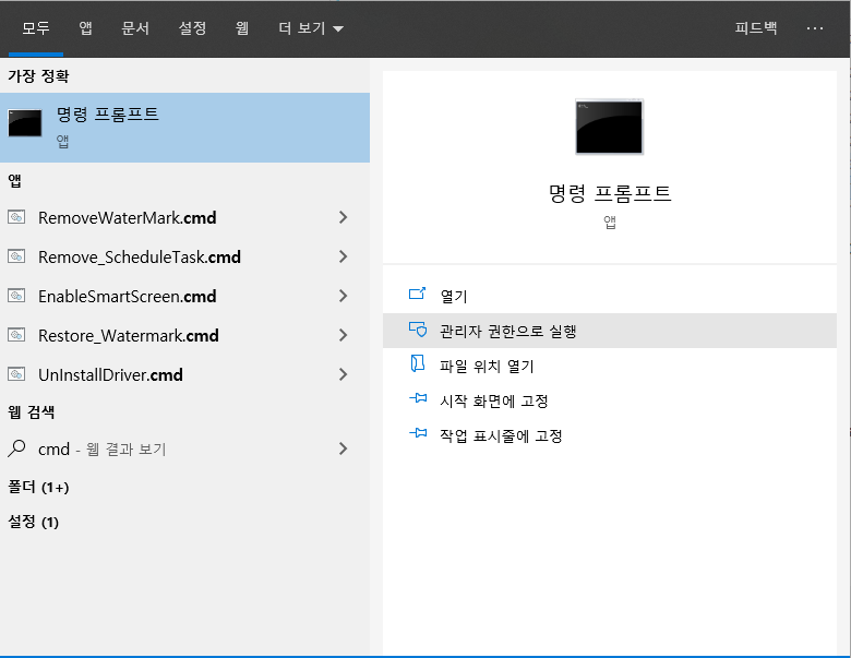 윈도우 작업표시줄의 검색을 통해 cmd를 타이핑하고 기다리면 위 명령 프롬프트가 나타납니다.