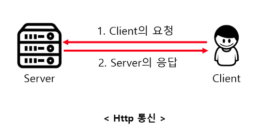 Http통신은 Client의 요청이 있을 때만 Server가 응답하여 처리를 한 후에 연결을 끊는 방식이다. 이러한 연결 방식은 Client가 요청을 보내는 경우에만 Server가 응답하는 단방향적 통신으로, Server가 Client로 요청을 보낼수는 없다.