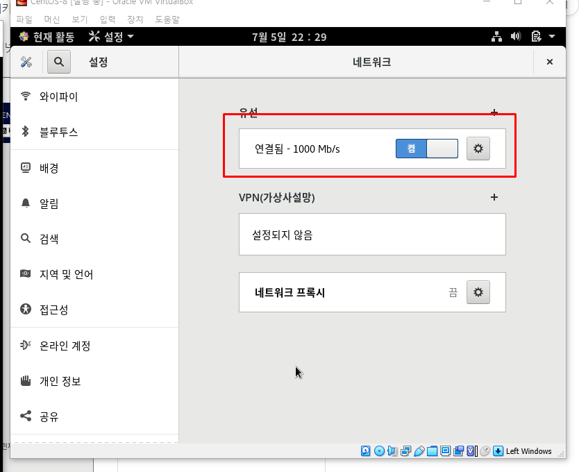 리눅스 설정에 들어가서 네트워크 켬으로 바꿔주면 되겠다.